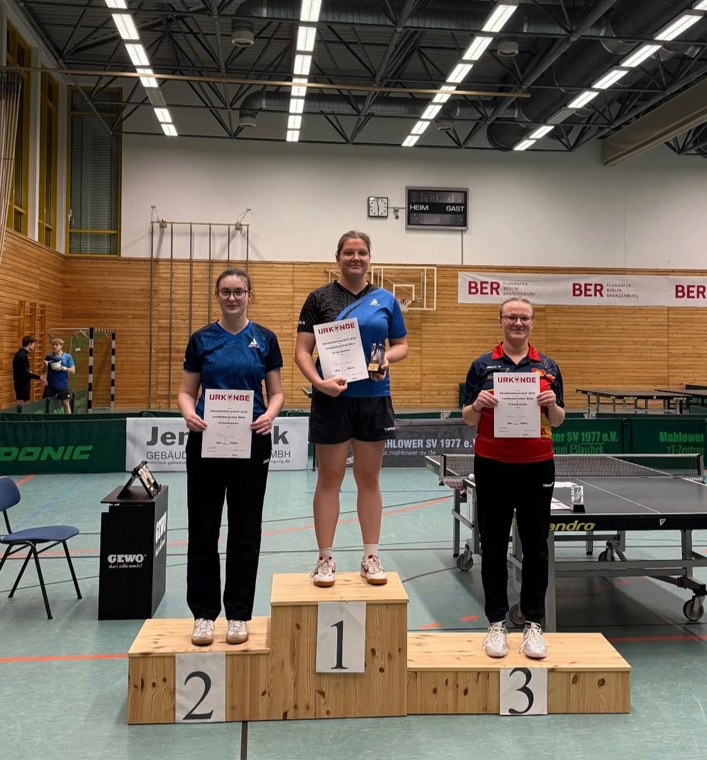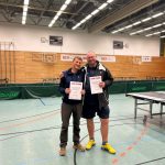 Eine Woche später waren wir bei den Erwachsenen in Mahlow mit insgesamt sechs Teilnehmern am Start. Chris und David Jannek kämpften sich im Herren Doppel bis ins Halbfinale, verloren dann aber knapp mit 2:3, was am Ende Platz drei bedeutete. Carlsson sicherte sich nach starker Leistung mit dem Einzug ins Viertelfinale das Ticket für die Landesmeisterschaften. Bei den Damen verlor Lena erst im Finale mit 1:3 gegen Wencke Dauwitz. Das Ticket für die LEM hatte sie ja bereits sicher. Amalia ist mit Platz sechs erste Nachrückerin und kann so auch noch auf einen Startplatz bei den Landesmeisterschaften hoffen. Regine verpasste trotz starker Leistung mit einer 2:2 Bilanz nur denkbar knapp die Ko-Runde.